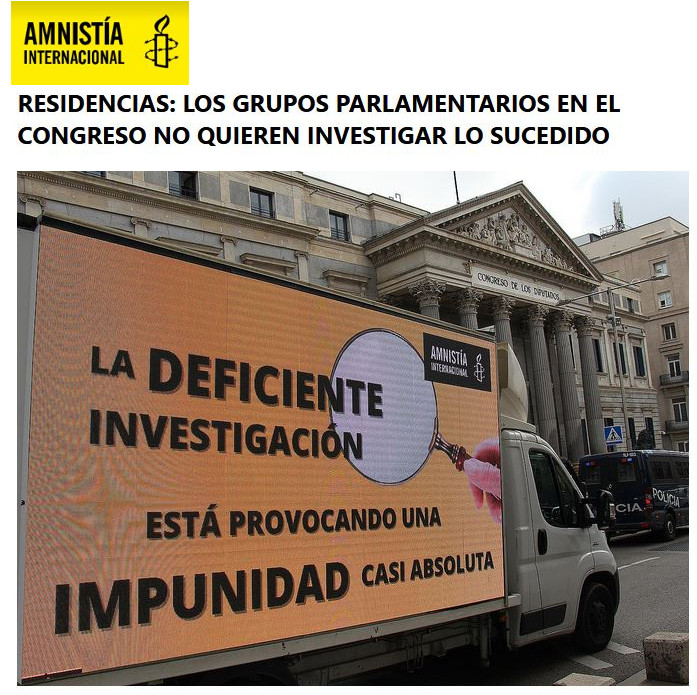 Dos meses después de que presentara su investigación sobre la impunidad por lo sucedido....que Amnistía Internacional documentó, en una investigación llevada a cabo en diciembre de 2020, dio el resultado que las personas mayores, durante la primera ola de la pandemia, vieron vulnerados su derecho a la salud, a la vida, a la no discriminación, a la vida privada y a una muerte digna. Y, a pesar de la gravedad de los hechos, la organización ha denunciado cómo 9 de cada diez investigaciones penales de Fiscalía han sido archivadas